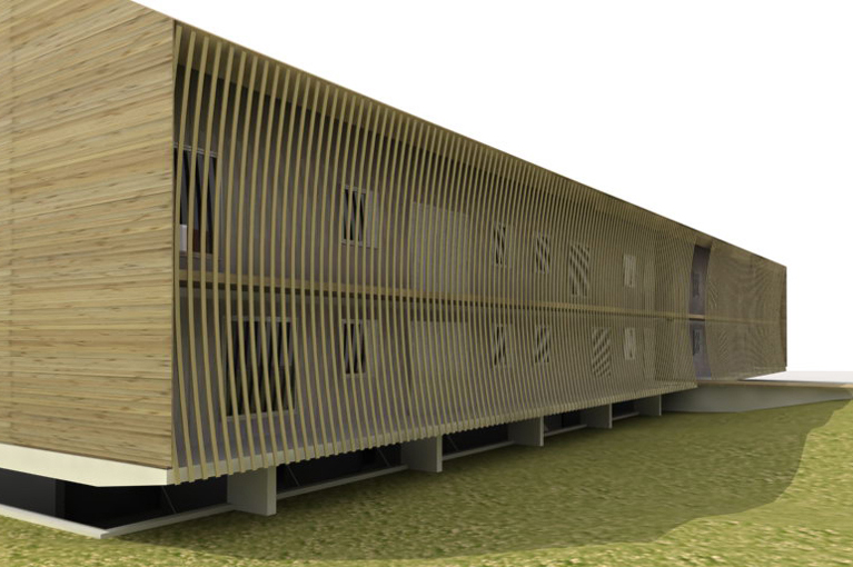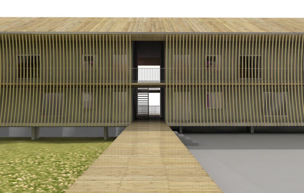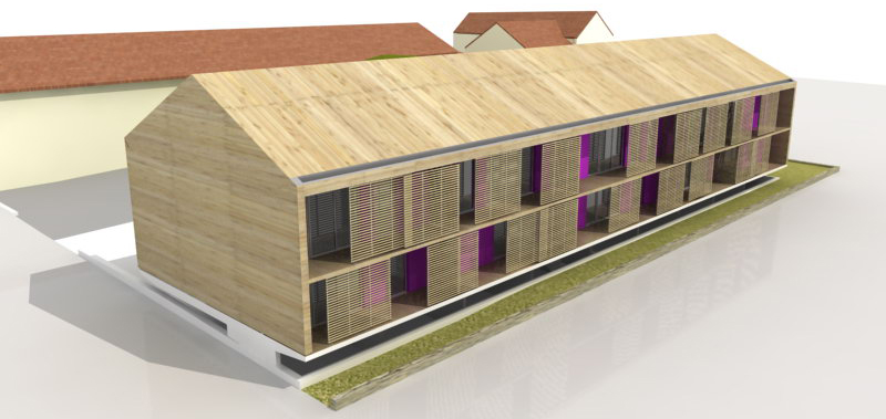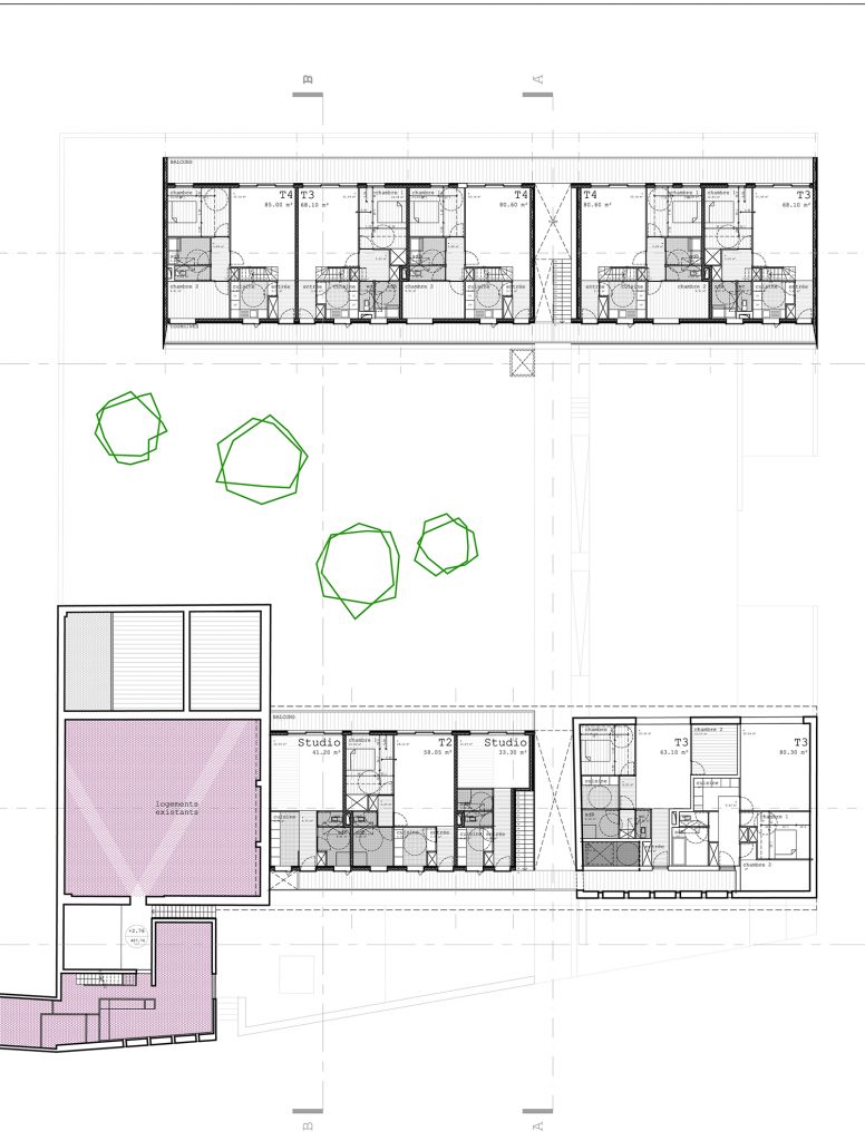 A l’intérieur de la parcelle, reprenant le gabarit de ce nouvel ensemble, un bâtiment neuf en ossature bois s’installe en parallèle. Il abrite 12 logements desservis par une coursive fermée par un claustra de bois incurvé.