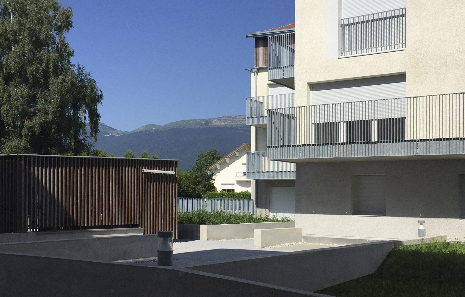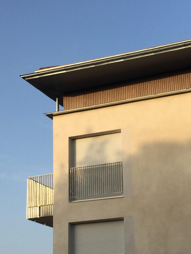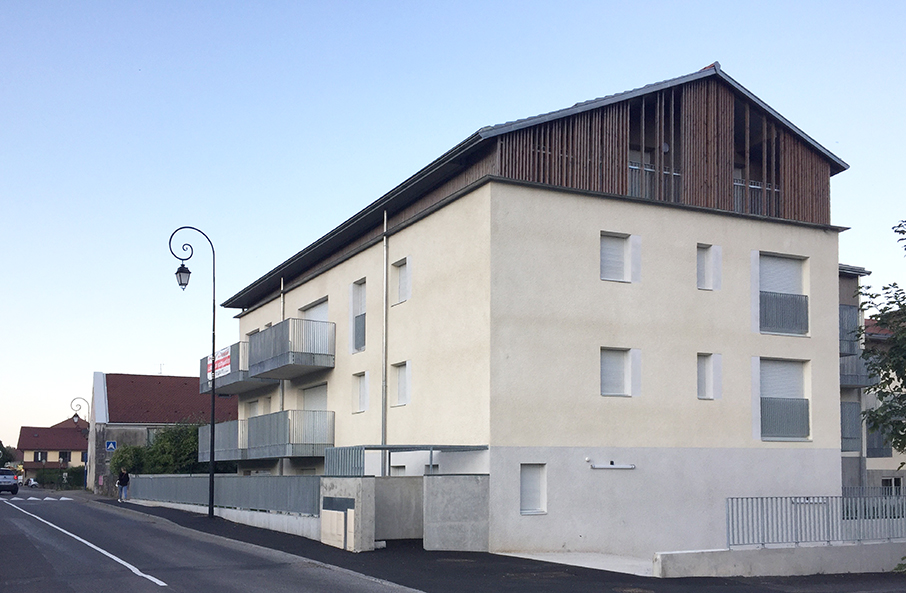La géométrie irrégulière des deux bâtiments est coiffée d’un attique en bois, de hauteur variable. Le volume bas, en maçonnerie enduite, est détaché de ce couronnement par une fine casquette en zinc naturel.