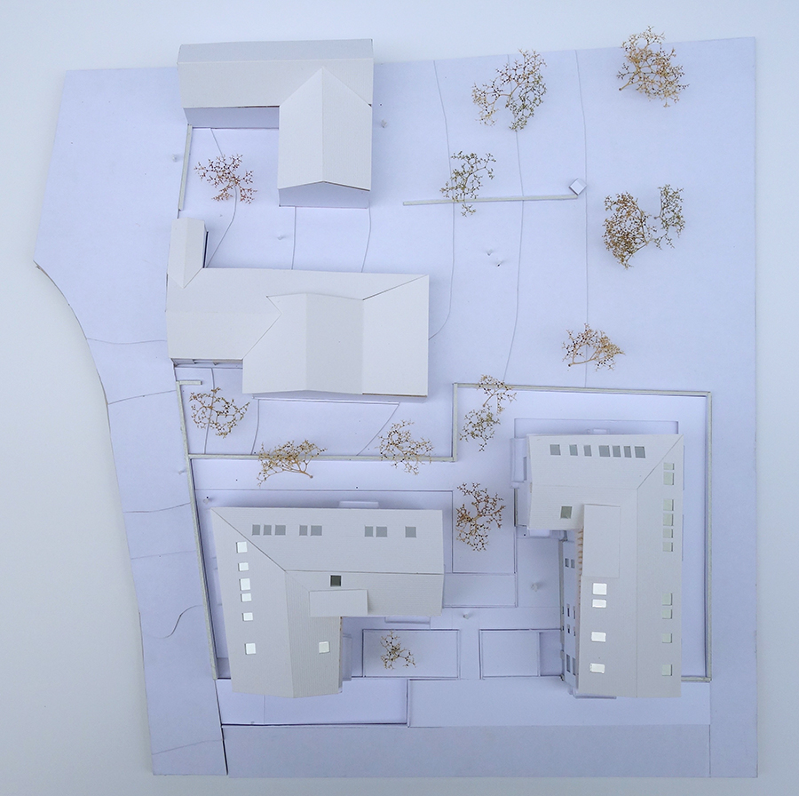 La volumétrie en L des deux bâtiments s’inspire directement des bâtiments voisins. Les deux petits immeubles sont disposés afin d’offrir des dégagements visuels depuis la route.