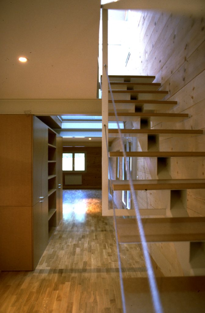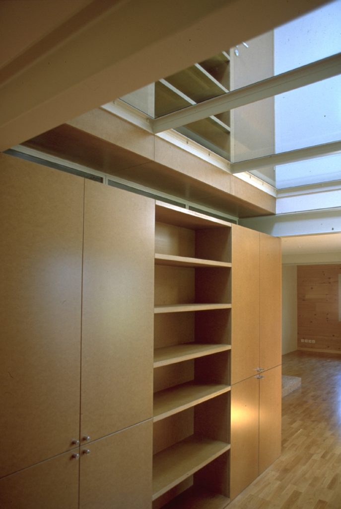 Ce mouvement vertical est accompagné par la bibliothèque double hauteur en médium derrière laquelle se cachent sanitaires, vestiaires et salle de bain.