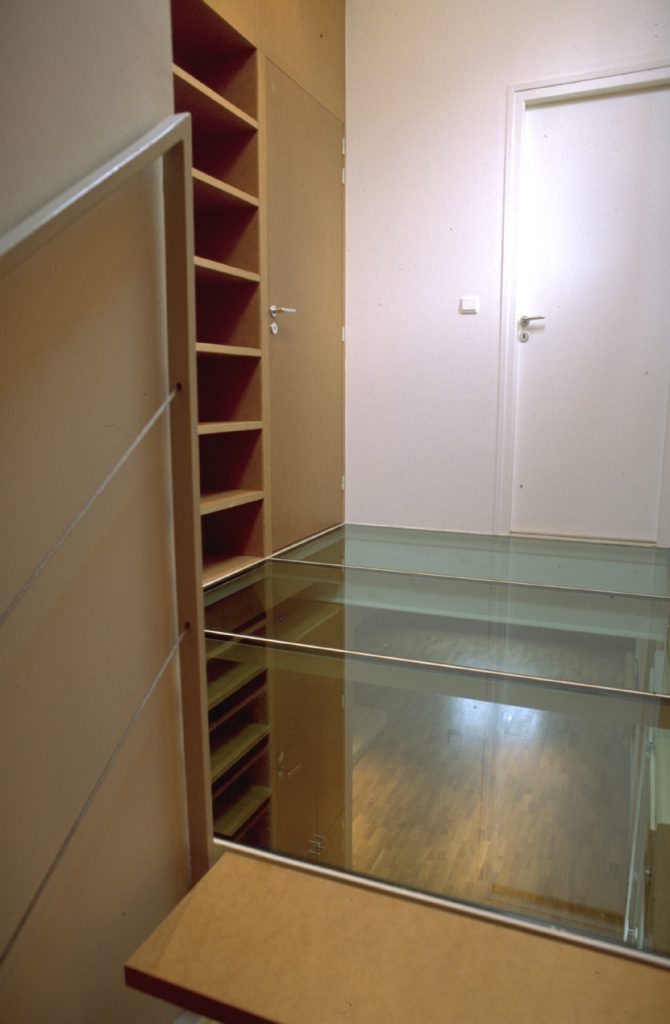 La hauteur de 6 m se retrouve en zone centrale, au-dessus de l’entrée, grâce au plancher de verre du palier des chambres. Celui-ci conduit également une lumière zénithale, captée en toiture, qui irrigue les deux niveaux.