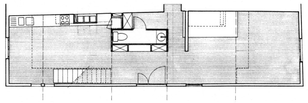 Travaillé dans sa longueur et sa hauteur, le projet préserve les grandes dimensions du volume initial : le premier niveau est un espace traversant qui se développe sur toute sa longueur où se succèdent cuisine, entrée et séjour; le second comprend deux chambres qui apparaissent comme deux boîtes posées sur les poutres métalliques transversales qui font la liaison entre les deux murs principaux.