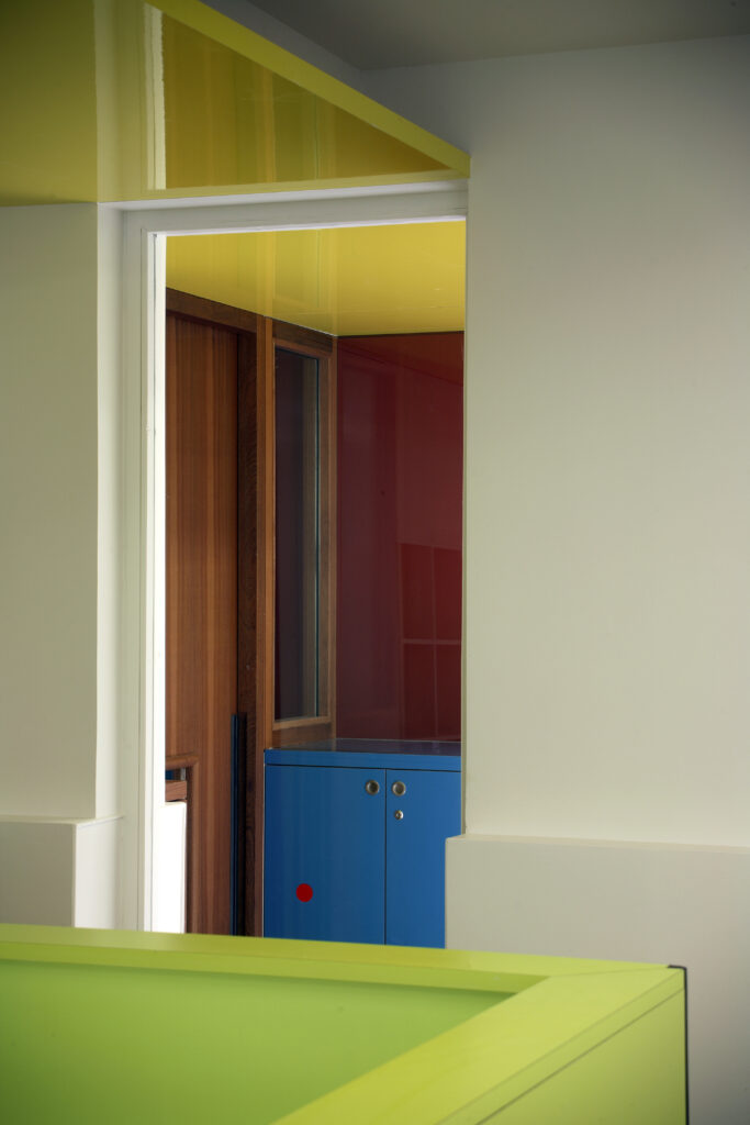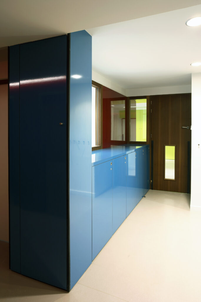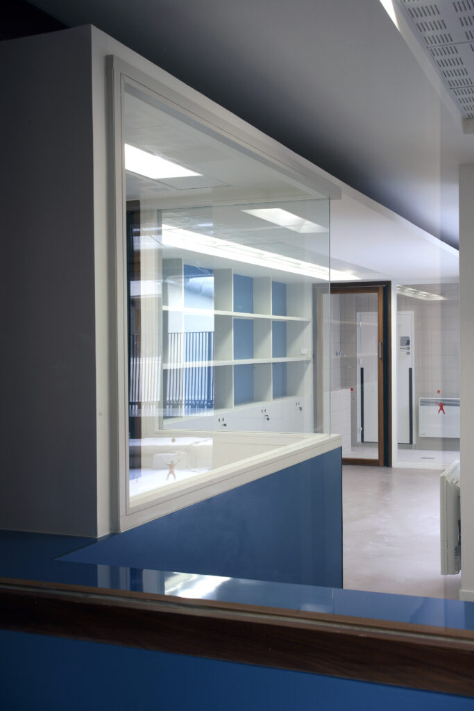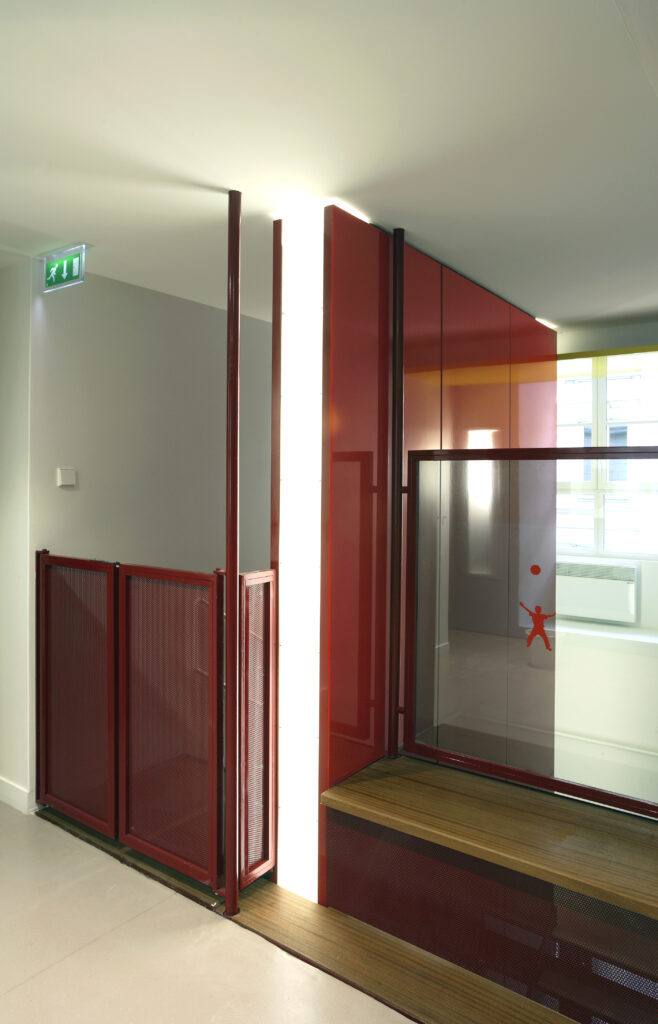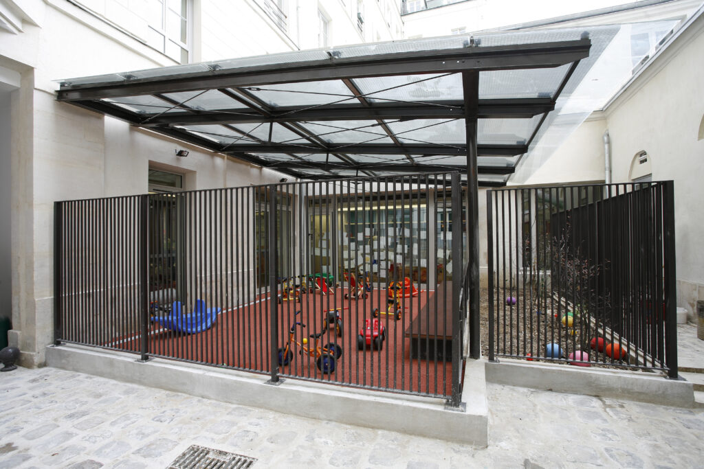 Le manque de lumière a conduit à aménager de nombreuses transparences entre les différentes pièces. D’où une multiplication des châssis et portes vitrées. L’aménagement des locaux, guidé par la volonté d’offrir un cadre de vie chaleureux, évite à dessein toute connotation puérile : simplicité des lignes, qualité des matériaux et couleurs chatoyantes. La cour des enfants est protégée par une verrière. Une bande plantée d’érables japonais assure l’intimité des petits pensionnaires avec le restaurant situé en vis-à-vis.