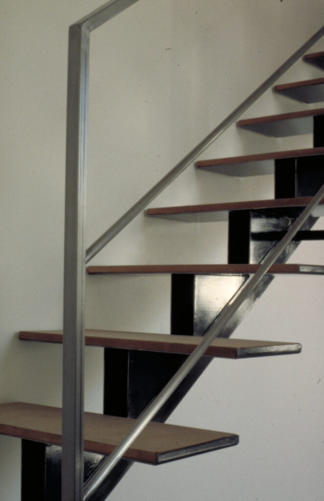 Depuis le séjour le volume de la chambre principale apparaît comme une boite en bois perché dans la charpente. Un escalier de métal sur limon central se pose sur la nouvelle structure pour rejoindre cette boite de bois ainsi que les autres chambres se trouvant à l’étage.