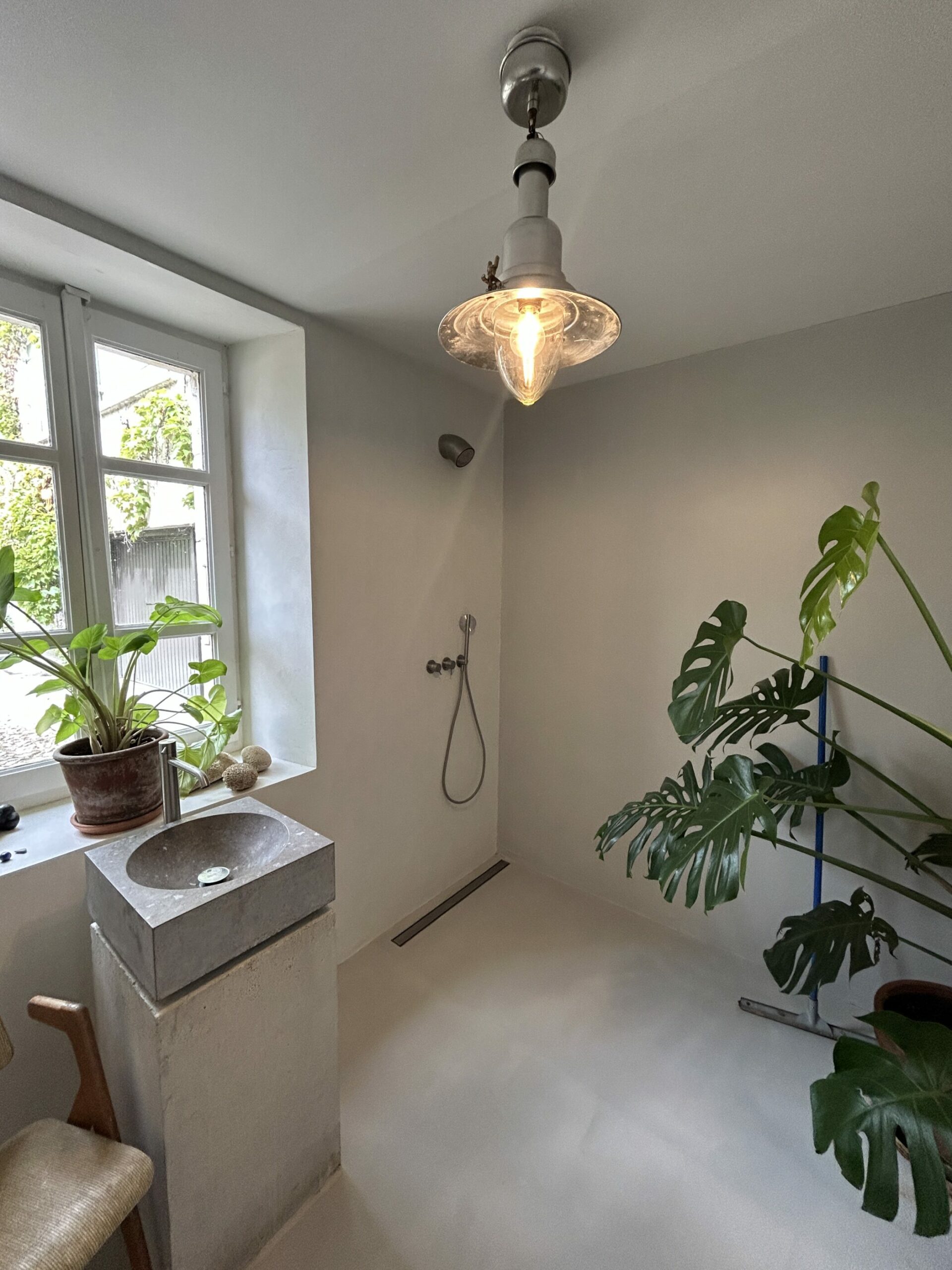 De nombreux éléments ont été volontairement laissés bruts, portant les traces du temps, et mis en valeur par des interventions contemporaines : menuiseries en aluminium, sols en béton ciré, enduits à la chaux sur les parois, socles et cheminée en béton brut.