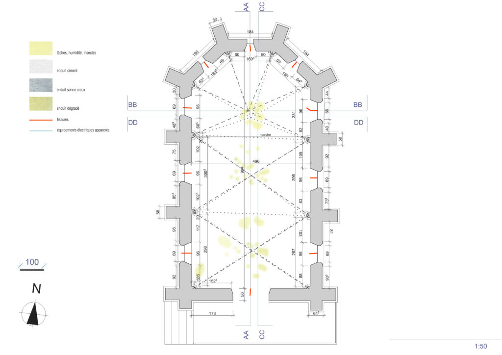 La couverture en amiante est restituée en ardoises. Les enduits ciment piochés pour une réfection complète des façades en enduits traditionnels à la chaux. L’intérieur et les vitraux sont également restaurés.